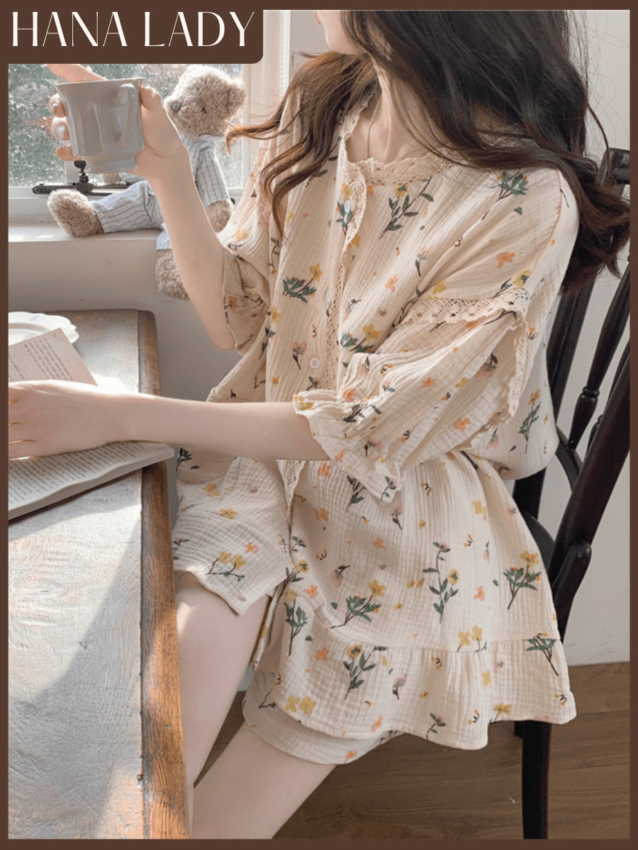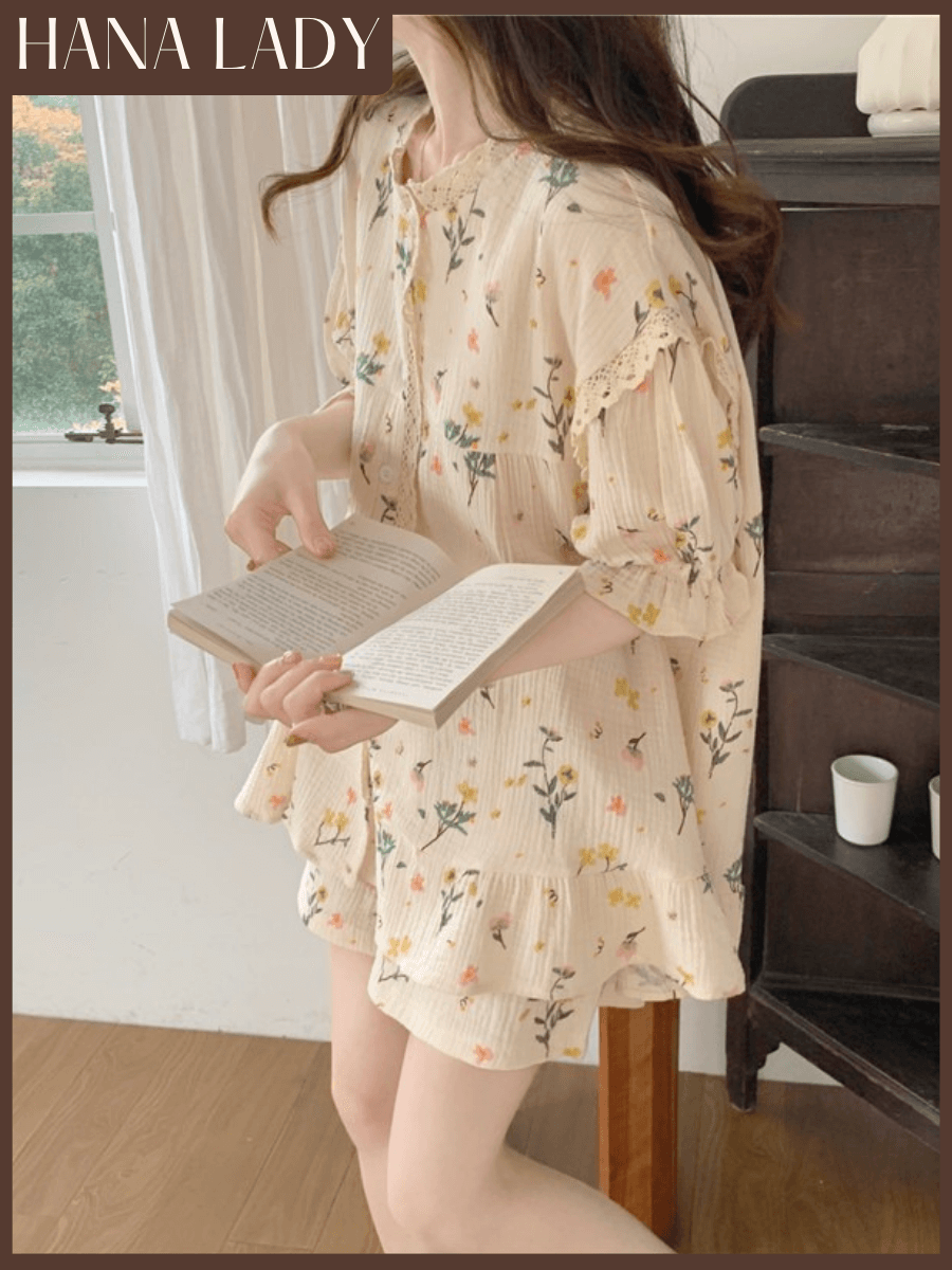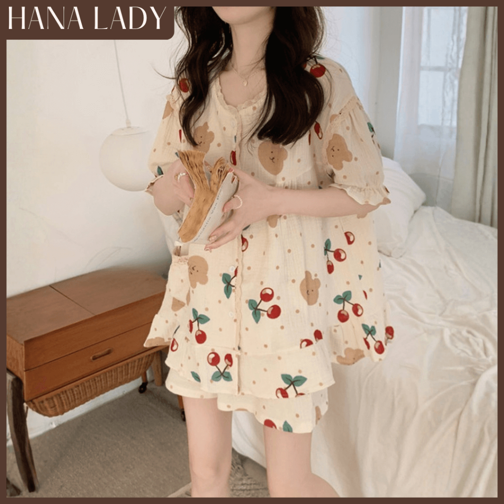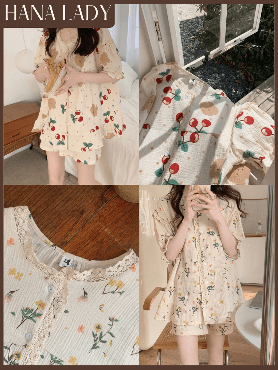 • Kiểu Dáng: Thiết kế cổ tròn, tay lỡ, quần đùi trẻ trung năng động, kết hợp viền bèo nhún phối ren dễ thương