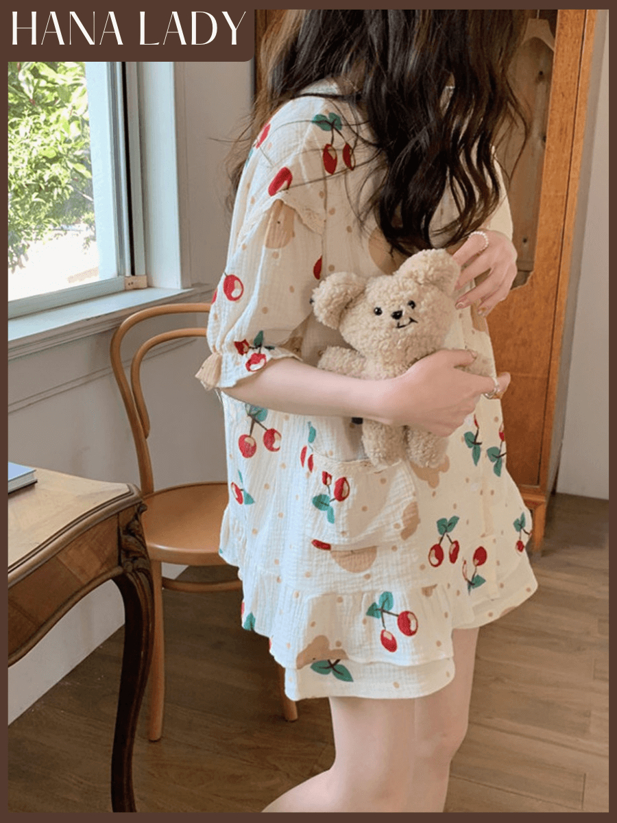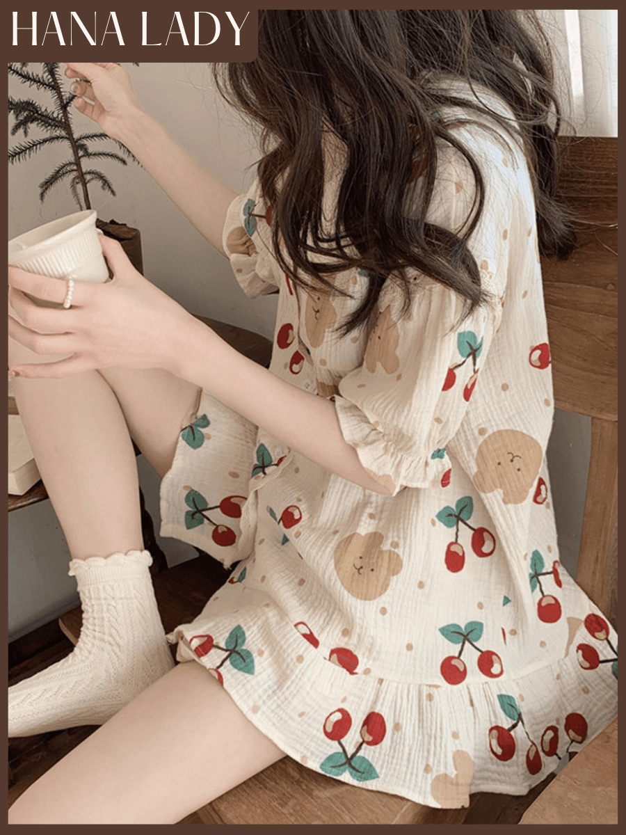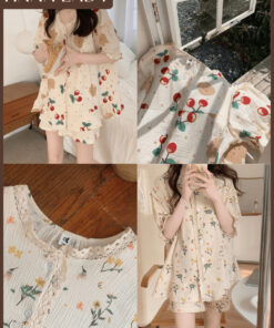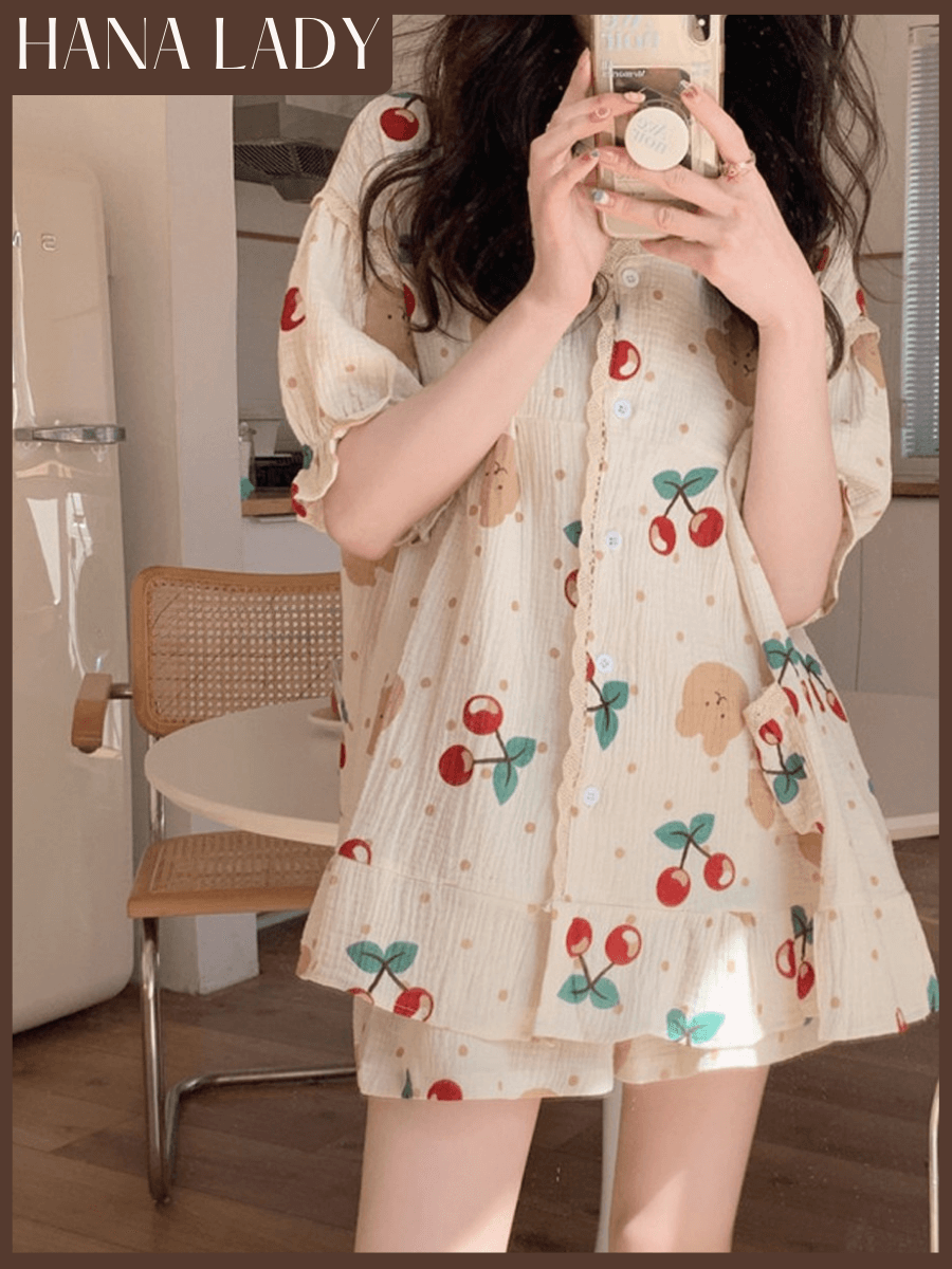 • Kiểu Dáng: Thiết kế cổ tròn, tay lỡ, quần đùi trẻ trung năng động, kết hợp viền bèo nhún phối ren dễ thương