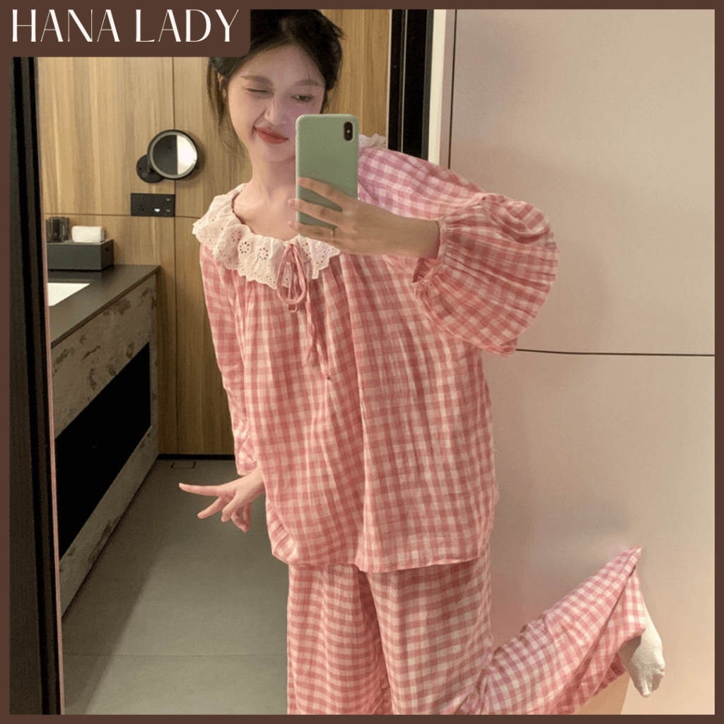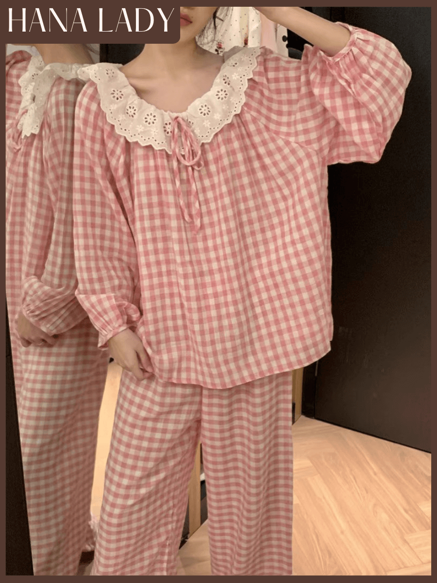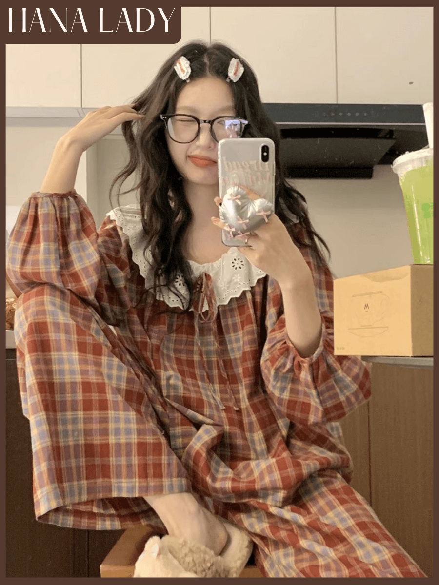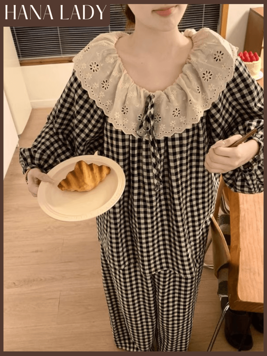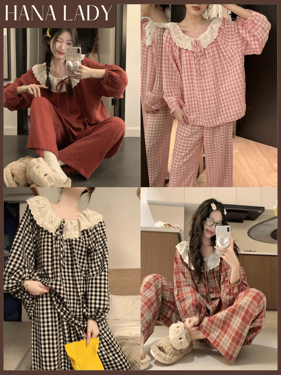 Bộ Đồ Ngủ Pyjama Dáng Dài Mặc Nhà Nữ Caro Cổ Tròn Phối Ren Tiểu Thư Thu Đông – Bộ đồ ngủ nữ chất liệu vải mây thoáng khí và nhẹ, mang lại cảm giác thư giãn tuyệt đối khi mặc ở nhà. Thiết kế dài tay – dáng dài, phù hợp cho mùa Xuân – Thu – Đông, vừa ấm vừa thoáng, không bí da.
