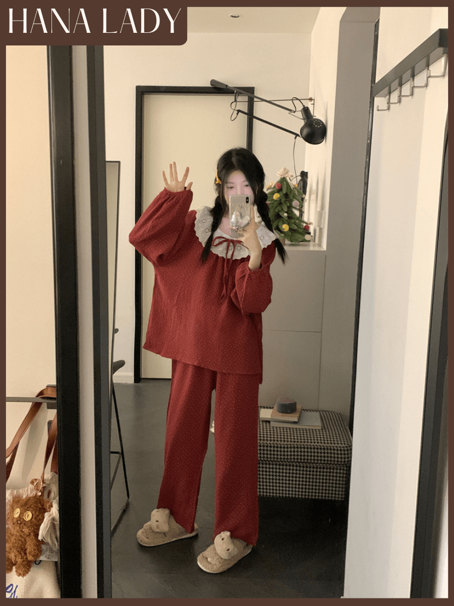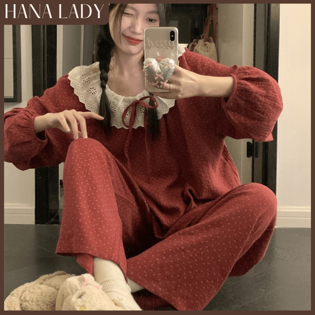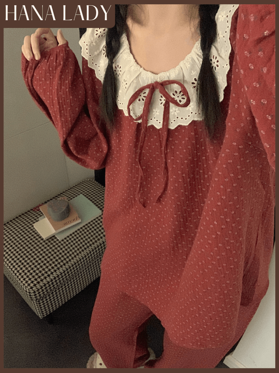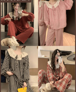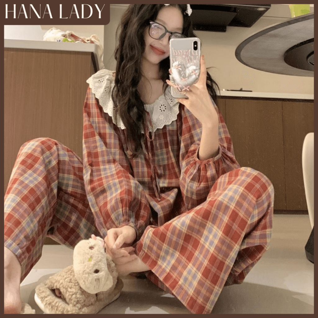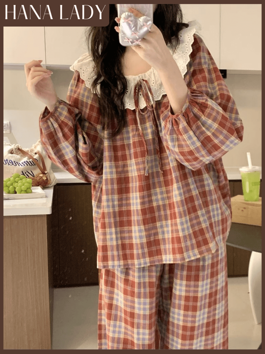 Bộ Đồ Ngủ Pyjama Dáng Dài Mặc Nhà Nữ Caro Cổ Tròn Phối Ren Tiểu Thư Thu Đông – Bộ đồ ngủ nữ chất liệu vải mây thoáng khí và nhẹ, mang lại cảm giác thư giãn tuyệt đối khi mặc ở nhà. Thiết kế dài tay – dáng dài, phù hợp cho mùa Xuân – Thu – Đông, vừa ấm vừa thoáng, không bí da.